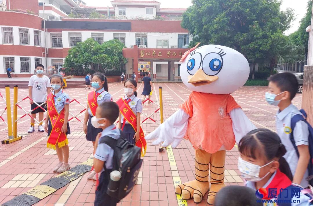 吉祥物“江江”、“晓晓”欢迎学生入校