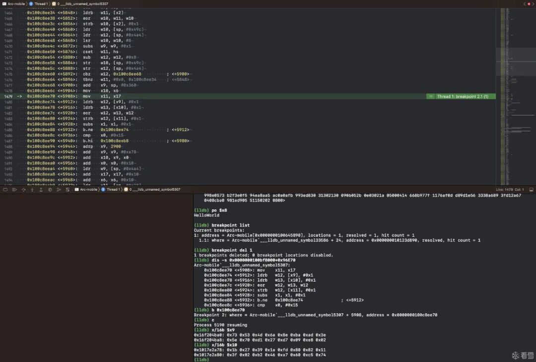 接下來我們要計算下斷點的地址,使用 target modules list LLDB 指令可以查看到主程序 Arc-mobile 的起始地址,在此基礎上加上函數地址的偏移值就是我們要下斷點的地址了。使用 LLDB 的 breakpoint 指令佈置斷點,然後執行任何可以觸發 API 請求的操作,比如隨便登錄一下,即可觸發斷點。