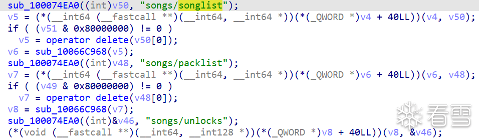 首先 Shift-F12 打開字符串界面,Ctrl-F 搜索 songlist,找到 songs/songlist 字符串,然後通過 XREF 找到這樣一個函數: