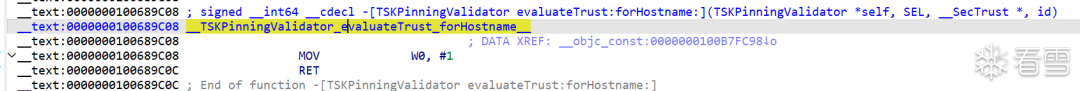通過搜索 Arc-mobile 中的一些字符串,可以確認遊戲使用了 TrustKit(https://github.com/datatheorem/TrustKit) 這一開源項目實現 Cert Pinning。簡單地閱讀一下 TrustKit 的代碼即可找到 [TSKPinningValidator evaluateTrust:forHostname:](https://github.com/datatheorem/TrustKit/blob/0617d99b534de6adb632ada2475ca8c20c644736/TrustKit/TSKPinningValidator.m#L84) 這個函數,對每個請求的目標進行證書驗證,如果成功則返回 True。知道了這點,要繞過這個 Cert Pinning 簡直輕而易舉。