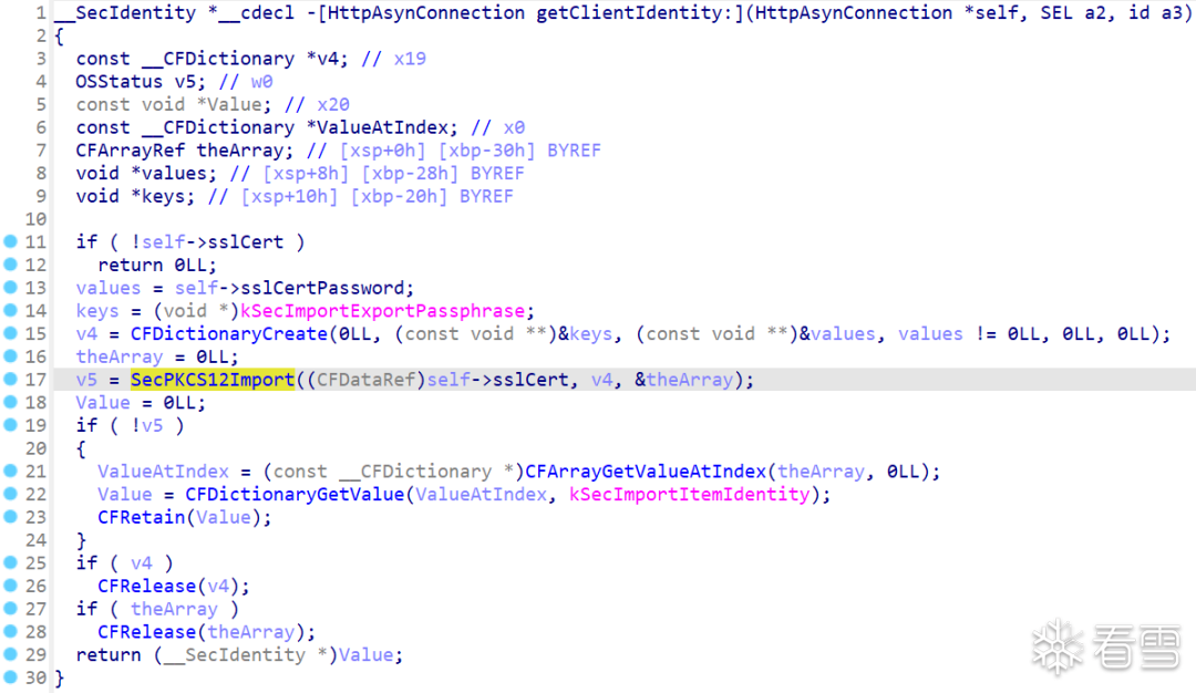 調試器跟進到讀取了 self->sslCert 的位置,然後在 LLDB 執行 po $x8 即可打印出 PKCS12 的二進制數據: