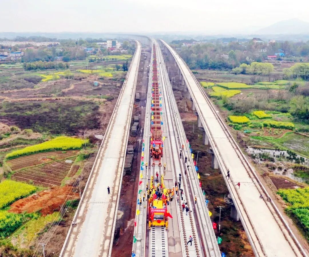 自2019年12月18日开始铺轨施工以来,为保证工期目标顺利完成,建设单位不断优化施工组织,针对线路工况,采用自主研发的铁路有砟无砟一体式铺轨机组,该机组可实现有砟和无砟施工模式的自由切换,日铺轨量可达6公里,既保证了施工效率也解决了有砟无砟交替施工的难题。