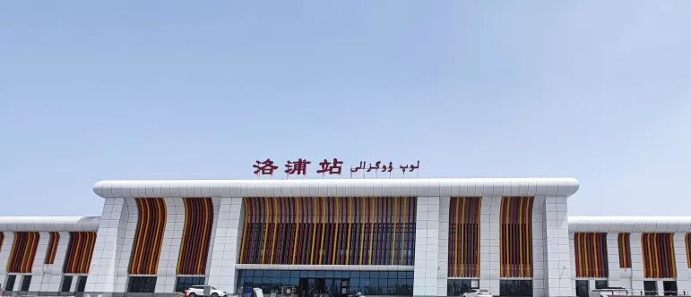 洛浦站以“艾德莱斯绸发源地”作为创作灵感,门窗处穿插了悬垂的“丝绸”,体现丝绸轻盈、多姿的特点,表现出车站的庄重大气。