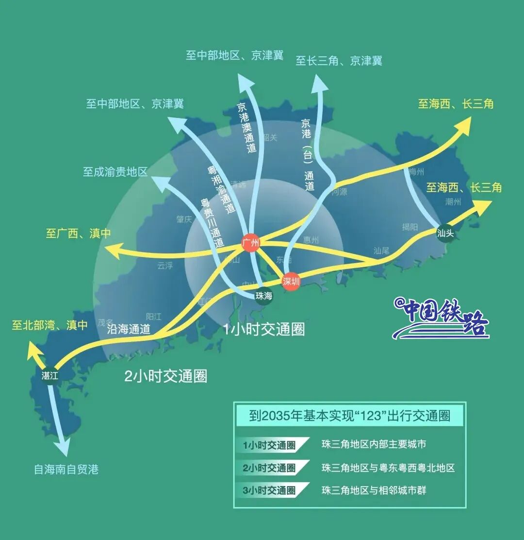 随着高铁新线的不断加入,广东高铁版图串珠成线,织线成网。“十四五”期间,广东将打造“一中心三极点”综合交通枢纽布局,即以粤港澳大湾区为中心,汕头、湛江、韶关为极点,形成轴带支撑、多向联通的综合交通分布。