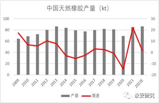 据ANRPC,预计2022年天然橡胶产量小幅增长,自2021年的1405.3万吨增长至1438.2万吨;增速从3.6%下滑至2.3%。而需求自2021年的1453万吨增长至1480.1万吨,增速则从12.2%大幅下滑至1.9%。