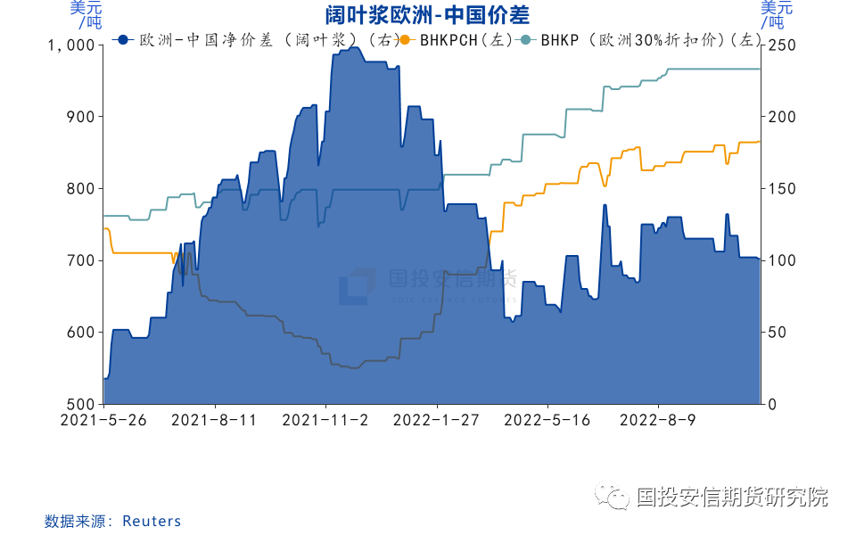 从运输周期来看,一般中国进口量延后全球发运量大概两个月左右的时间,反映到进口量,我们看到今年整体中国进口量下滑,尤其是针叶浆当月进口处于近几年历史低位,1-9月份针叶浆累计进口量为537.21万吨,同比去年减少17.22%,阔叶浆累计进口量为976.28万吨,同比去年增加1.54%。目前中国阔叶浆的进口得到恢复,上文分析中,随着巴西地区的运输问题逐步缓解,阔叶浆发运量得到明显提升,另外是随着中远海特开始做纸浆物流,投入到南美市场的运力大大增加,国内阔叶浆供应快速修复。而针叶浆进口仍处于较低水平,一个是全球针叶浆发运量比较低,上文分析了,主要原因在于加拿大运输还存在一定问题,另外就是欧美价格优势,针叶浆会更有动力发往西欧和北美。目前来看,中国的针叶浆供应恢复还需要一定的时间。