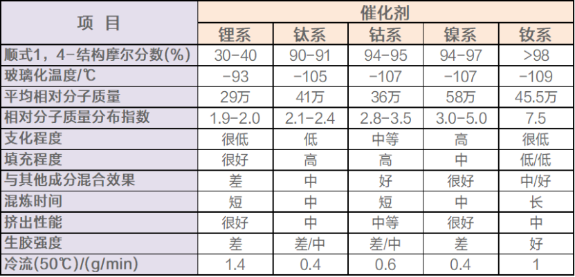 按照催化剂种类不同,丁二烯橡胶可以分为以下五个体系:锂(Li)系、钛(Ti)系、钴(Co)系、镍(Ni)系和钕(Nd)系。