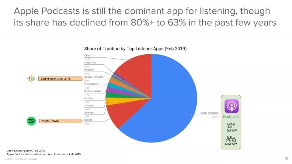 苹果的播客服务在音频类应用中一直占据主导地位。但近期由于谷歌开始进军这一领域,以及Spotify的崛起,苹果的市场份额从超80%下降到63%。