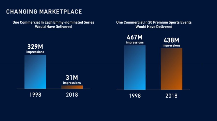 在一篇名为“线性电视中体育是最重要的”的文章中,他引用了福克斯首席运营官约翰•纳伦的话。他说,纳伦最近告诉投资者,传统广播公司向大量观众投放广告具有挑战性的深层原因是:“我们所处的这个时代,广告人通过高品质内容触及消费者的能力消失了90%以上。1998年,如果一个广告客户购买了20个大型体育赛事的广告单元,他们将积累4.67亿的认知度。在2018年,同样的活动则会带来4.38亿的认知度,可以发现,降幅只有6%。”