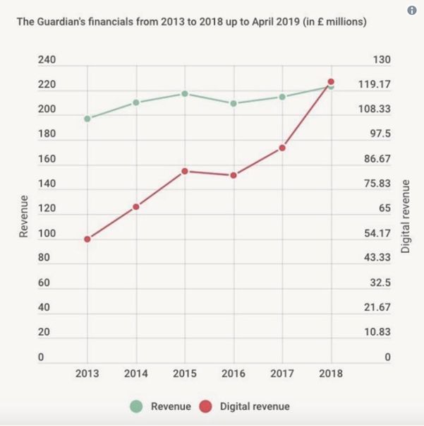 今年五月初英国老牌报纸《卫报》对外公布:“《卫报》自1998年以来首次获得盈利。”《卫报》如今拥有65.5万的纸质版和数字版用户,以及30万的一次性付费用户。据统计《卫报》新闻媒体集团在2018-2019年度的营业利润达到80万英镑,这与三年前《卫报》57万英镑的巨额亏损形成了鲜明的对比。