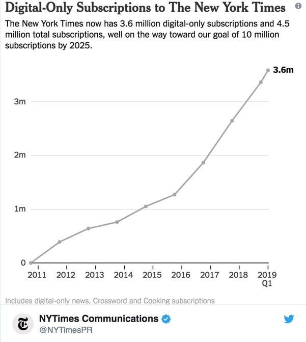 2019年第一季度末,《纽约时报》公司宣布他们已经拥有450万订阅用户,其中包括350多万的数字订阅用户,到2025年订阅用户的规模有望迈过千万大关。