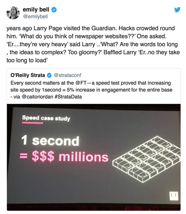 最近在伦敦举办的Strata数据大会上,《金融时报》首席产品和信息负责人Cait O’Riordan所做的演讲,再次重申加载速率对媒体机构的重要性。网速测试结果发现,站点加载速率每提高1秒钟就能够为整个站点的用户参与度带来5%的增长。这完美体现了时间就是金钱的古训,因此媒体行业要时刻注重技术上的跟进,确保在内容之外的其他配套服务也能有效抓住用户。