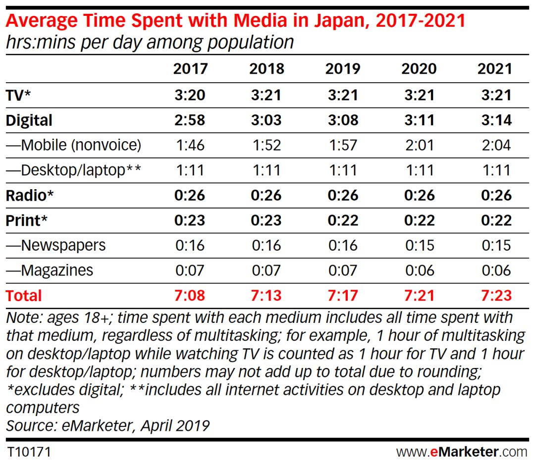 在2019年,日本成年人日均媒体消费时间为7:17,比2018年增加4分钟。2021年,将增加至7:23。