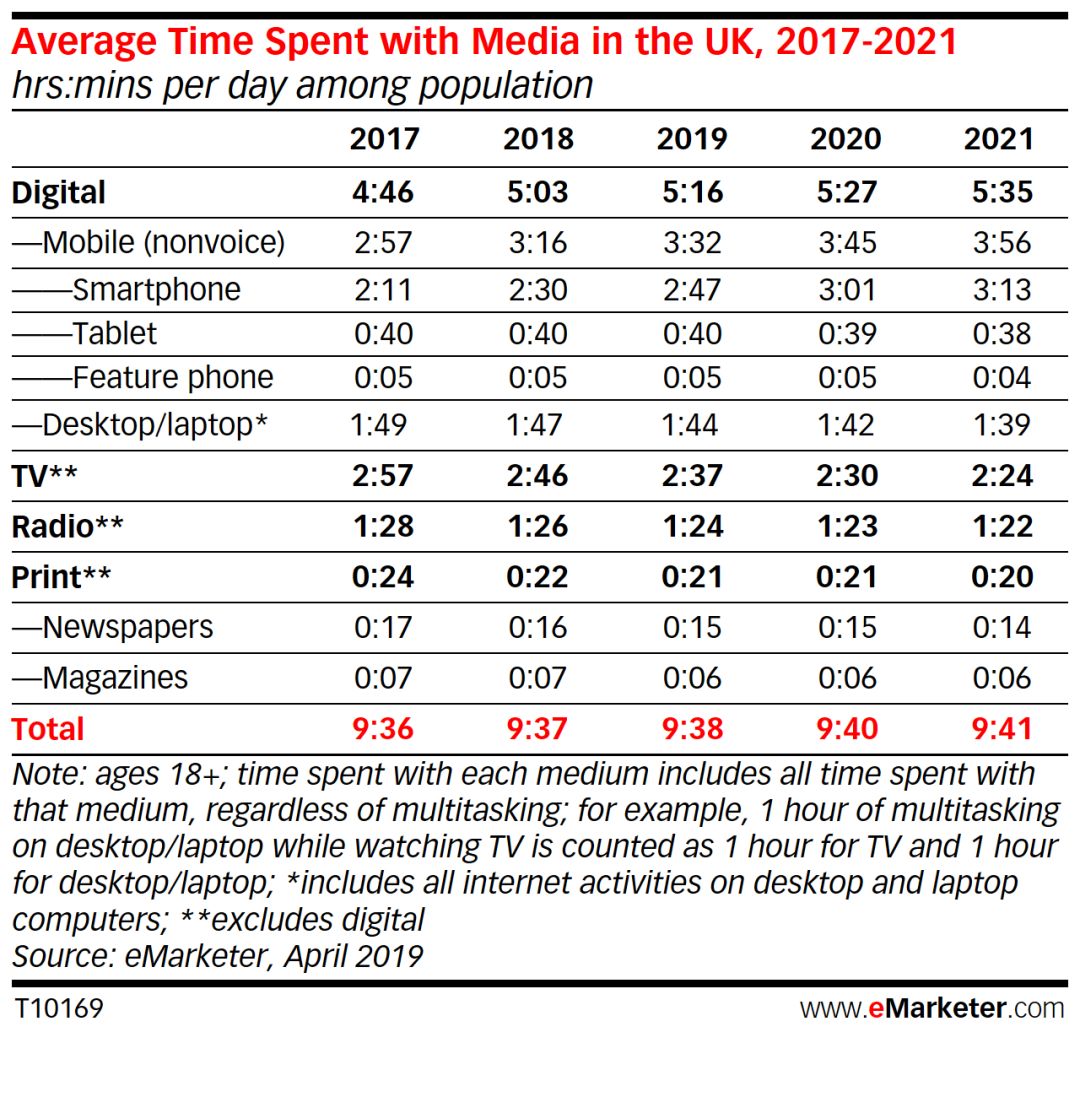 所有传统媒体(包括电视,纸媒和广播)的时间都将在2019年下降。例如,传统电视的消费时间将减少3.2%,至2:28,广播将减少2.9 %,到11分钟,纸媒仅为5分钟。