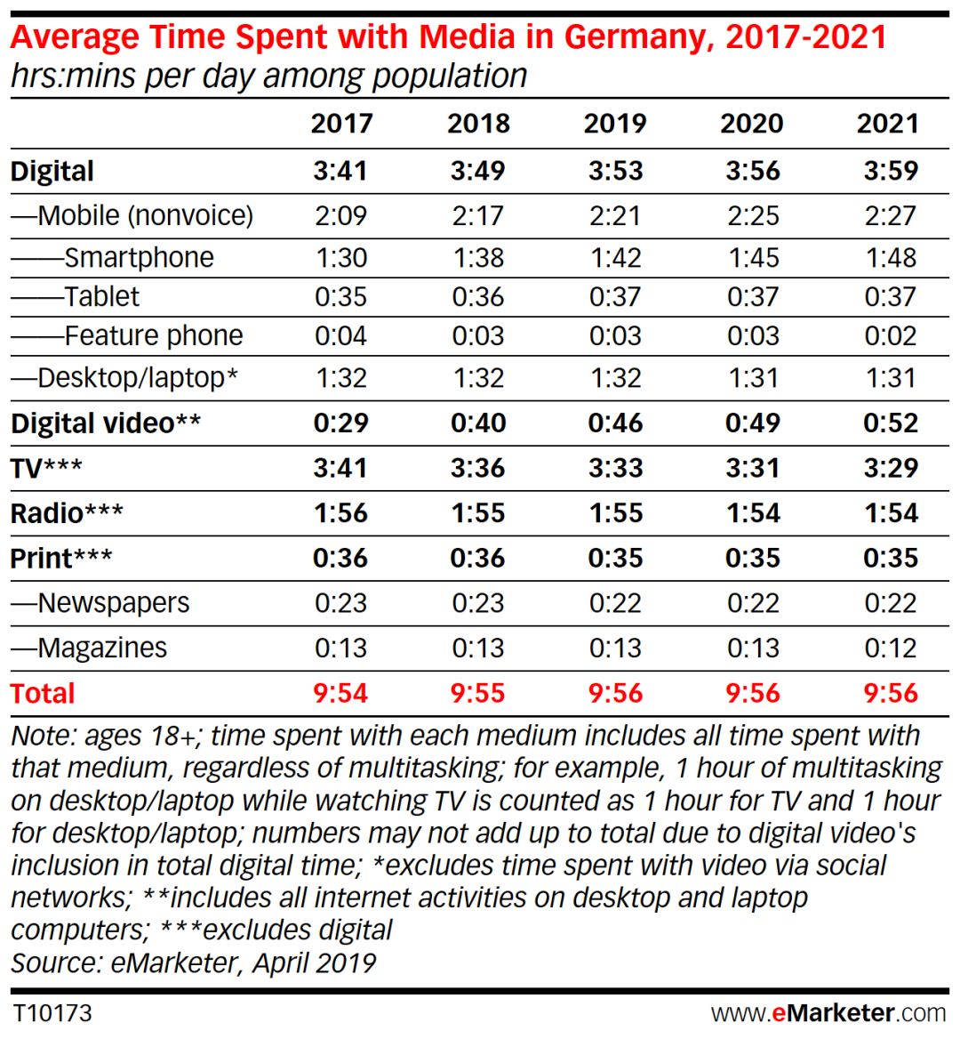 2019年,德国成年人的日均媒体消费时间在10个小时,这个数字从2017年和2018年仅上升1分钟。表明同法国、美国一样,德国媒体消费也已趋于稳定,并且能够预见未来会保持或接近当前水平。