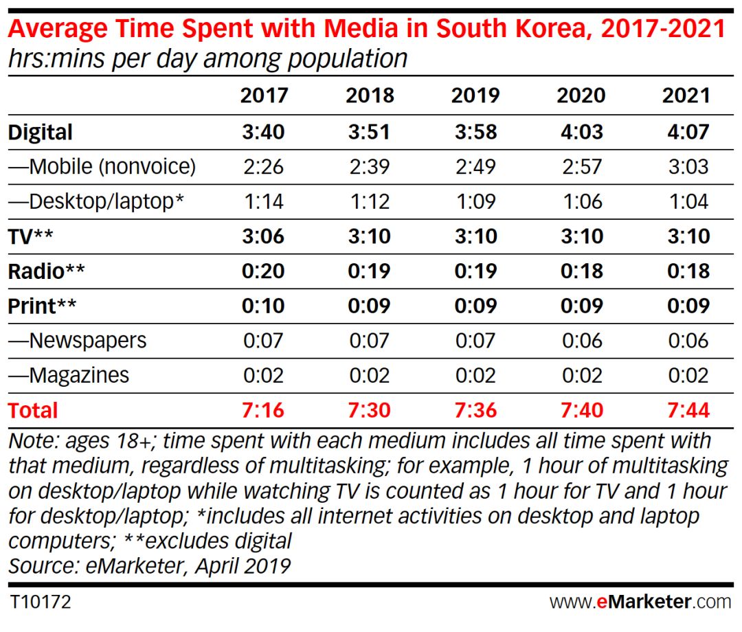 韩国的数字用户渗透率接近饱和,但每天在数字平台和设备上的使用时间持续上升。今年韩国的数字媒体日均消费总时间为3:58,比2018年增加了7分钟。与此同时,韩国除了电视以外的所有传统媒体消费时间都将减少。数字平台,特别是智能手机的强劲增长将有助于抵消传统媒体的下降。