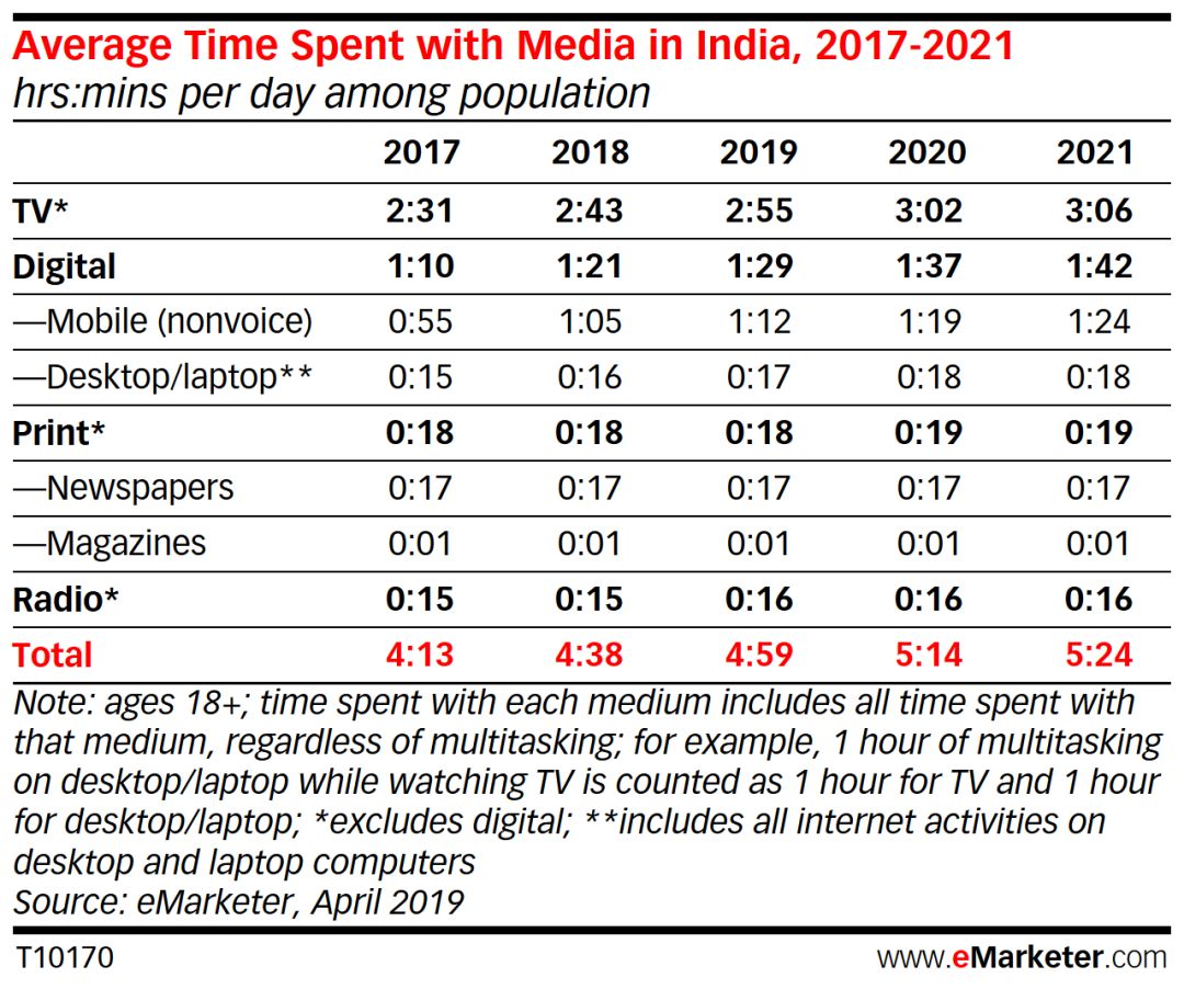 2019年印度日均媒体消费时间仅为4:59,其中数字媒体的增长率最高。与美国或西欧等发达市场的饱和度和稳定趋势不同,印度所有媒体渠道的渗透率和使用时间都会稳步增长。