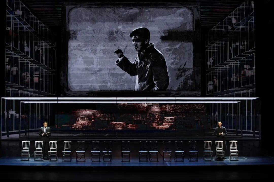 舞台构成方面,上方宽银幕,下方九块小屏变幻,九块小屏既是一体,又可以拆分为不同场景,影像有特写、近景、远景,针对各种史实资料的艺术处理,渲染时代氛围。国家话剧院优秀青年舞美设计、多媒体设计、灯光设计及影像导演、制作这次是“捆绑”式创作,以现代艺术的视角,让戏剧舞台呈现了一座假象的现代文献资料馆构成,设计们以这样的方式表达这部文献话剧的主题。可以说,《抗战中的文艺》结合了装置影像艺术与戏剧艺术各自的特性。前辈文艺名家的形象、作品与生平,在一种具有深厚历史质感的舞美氛围的映衬下,在大气磅礴的音乐声中,一一呈现在观众面前……