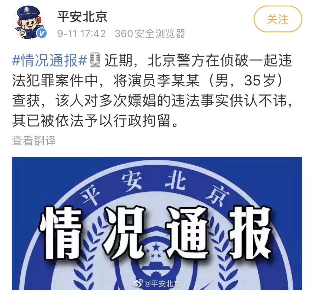 9月11日,“平安北京”发布情况通报称,近期,北京警方在侦破一起违法犯罪案件中,将演员李某某(男,35岁)查获,该人对多次嫖娼的违法事实供认不讳,其已被依法予以行政拘留。