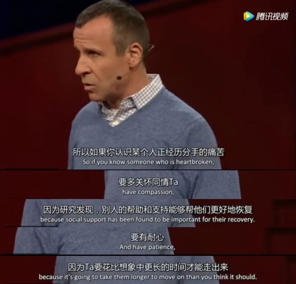 前几天看ted演讲中心理医生 Guy Winch 分享了《如何治愈失恋和心碎》这个话题,他提到自己接触的病人中,抗癌四年极度坚强的女性会因为失恋而心碎,五十六岁软件公司男高管也会因为失去爱人而备受打击。