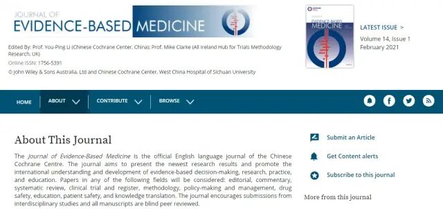 近日,由四川大学华西医院和Wiley出版集团合办的英文学术期刊Journal of Evidence-Based Medicine(JEBM)正式被SCI收录,首个影响因子将于2022年6月获得。