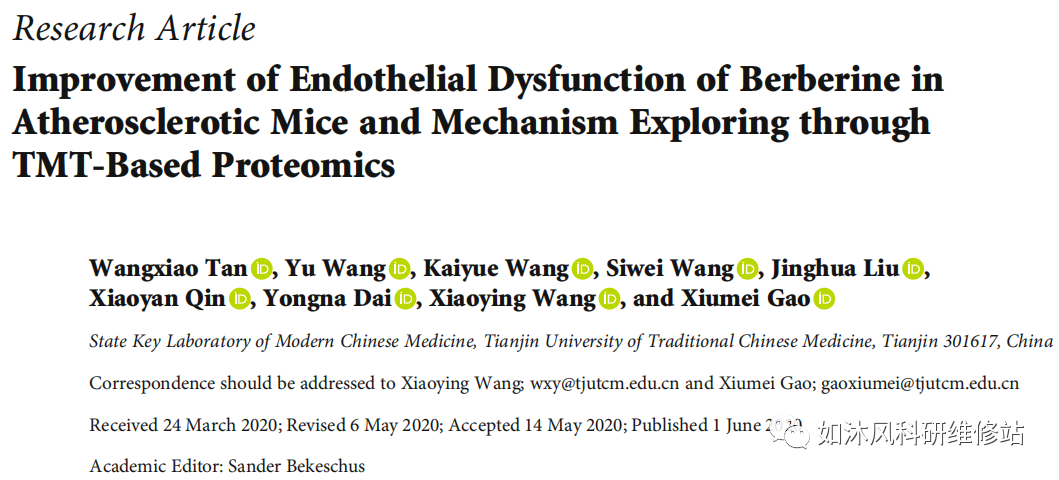 近日,天津中医药大学现代中药国家重点实验室高秀梅教授及王小莹教授课题组进行了基于TMT的蛋白质组学研究小檗碱对动脉粥样硬化小鼠内皮功能的改善及机制探讨的研究,并以“Improvement of Endothelial Dysfunction of Berberine in Atherosclerotic Mice and Mechanism Exploring through TMT-Based Proteomics”为题发表在Oxidative Medicine and Cellular Longevity(IF=4.868,https://doi.org/10.1155/2020/8683404)上。![]()