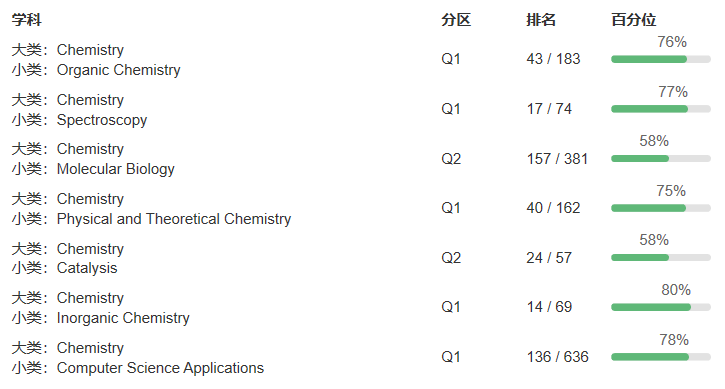 JCR分区:生化与分子生物学 2区、化学综合 2区