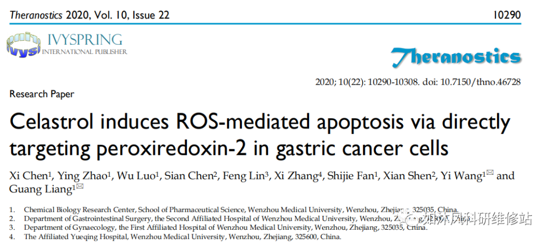 结论:我们的研究发现了潜在的Celastrol相互作用蛋白Prdx2及其作用的ROS依赖机制。这些发现也突出了Prdx2作为治疗胃癌的潜在靶标。