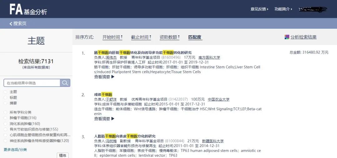 搜索结果极其丰富,比如检索到7131条有关干细胞的已立项标书,右上角展示了总金额: 316480.92 万元,即31个亿元,干细胞火不火不言而喻。