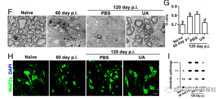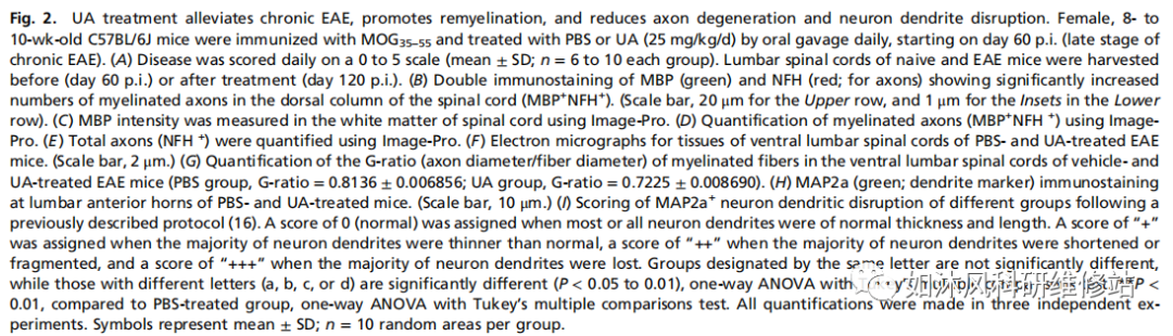 2.UA治疗可缓解慢性EAE,促进髓鞘再生并减少轴突变性和神经元树突破坏。