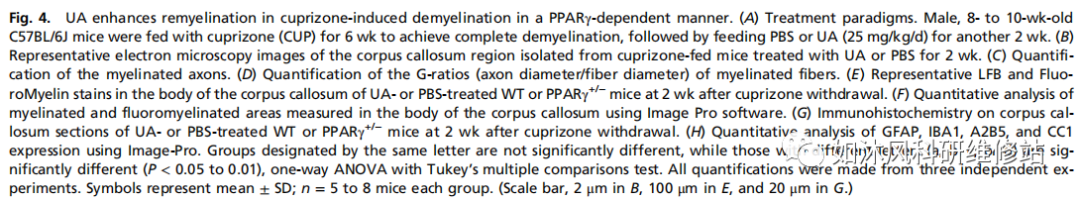 4.UA以PPARγ依赖性方式增强铜酮诱导的脱髓鞘中的髓鞘再生。