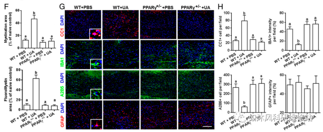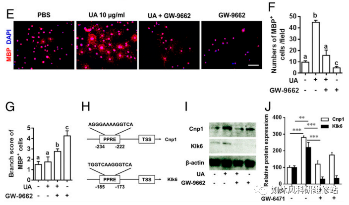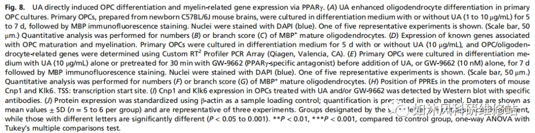 8.UA通过PPARγ直接诱导OPC分化和髓鞘相关基因表达。