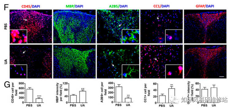 综上所述,本文发现,MS实验模型的慢性期通过免疫调节和少突胶质细胞成熟提供了对UA的神经修复能力的重要见解。我们还提供了负责Th1/Th17细胞,星形胶质细胞和OPC的发展中UA作用的细胞机制的详细信息。以上研究、出色的UA安全性研究、其低成本以及口服途径给药,为目前尚无有效疗法的MS慢性期的临床应用铺平了道路。