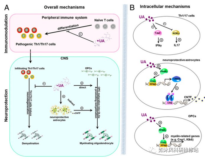 [机制部分] 在外周,UA抑制了CNS中Th1/Th17细胞的分化并减少了Th1/Th17细胞的浸润。在中枢神经系统中,UA通过直接和间接机制减少炎症和脱髓鞘并促进OPC成熟和髓鞘再生。(实验设计思路)