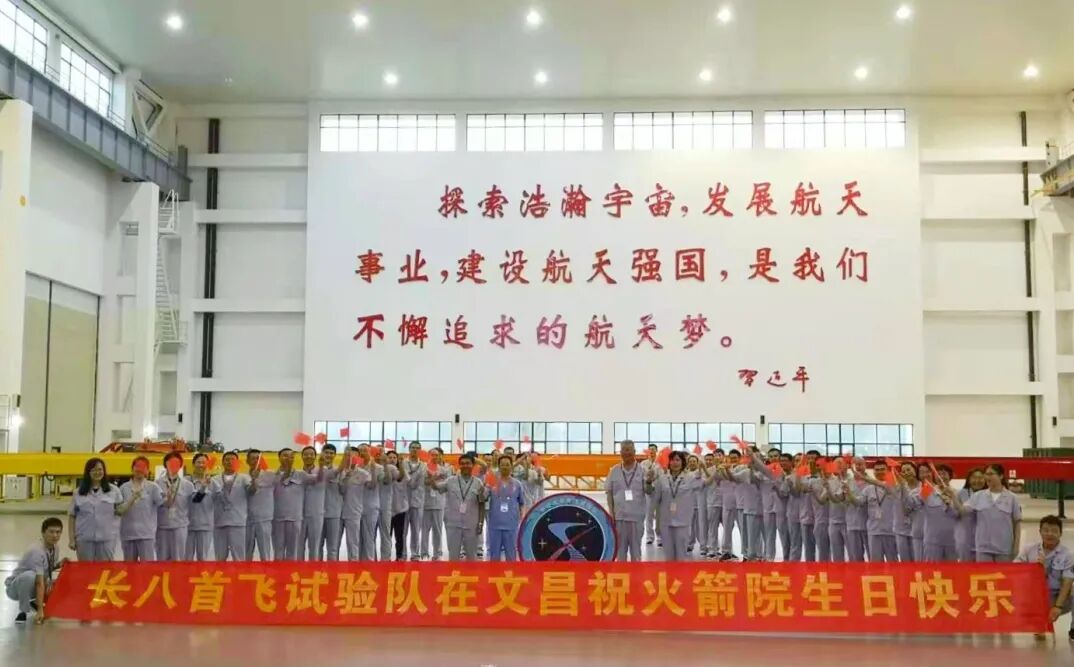 同时在海南文昌发射场执行任务的还有长征八号火箭首飞试验队。队员们站成一个“八”字的队形,手中挥舞着国旗,祝火箭院生日快乐,祝“长八”必胜!