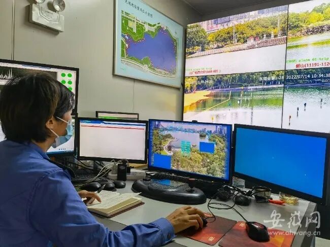 监控室内,工作人员通过摄像头24小时无死角监控天鹅湖。