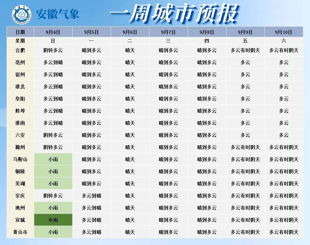 9-10日(周五至周六):淮北地区晴天到多云,淮河以南多云有时阴天。