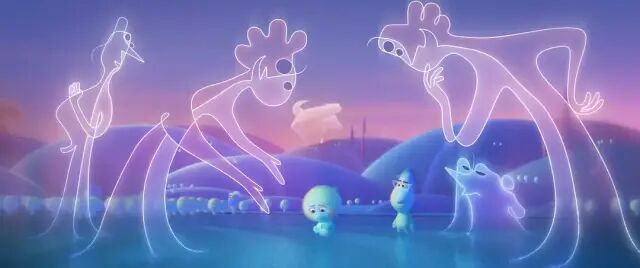在皮克斯团队强大的技术加持下,这个世界充满了轻柔和软糯,似草非草的地面、通透无色的建筑,还有众多轻盈飘逸的灵魂宝宝们。