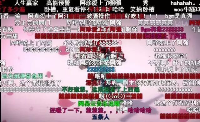 画面一片粉红,背景音乐变成了广东民谣《阿珍爱上了阿强》……开着弹幕看的话,欢乐百倍。