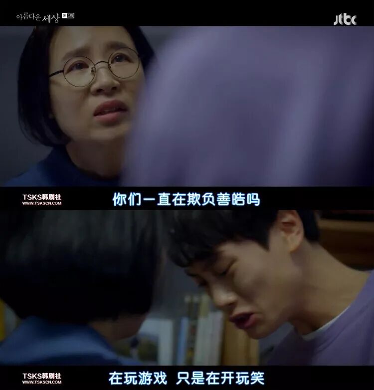 基灿爸爸去学校闹事时,责怪老师为何不好好看好学生,自己儿子又不是凶手,善皓不过是自己跳下去的。
