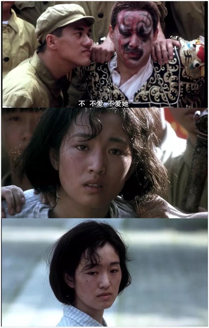 在丈夫被押到街上游行时,坚定无私的保护丈夫,看到丈夫揭发程蝶衣时,她的纠结与痛苦全部都有眼神传达出来。
