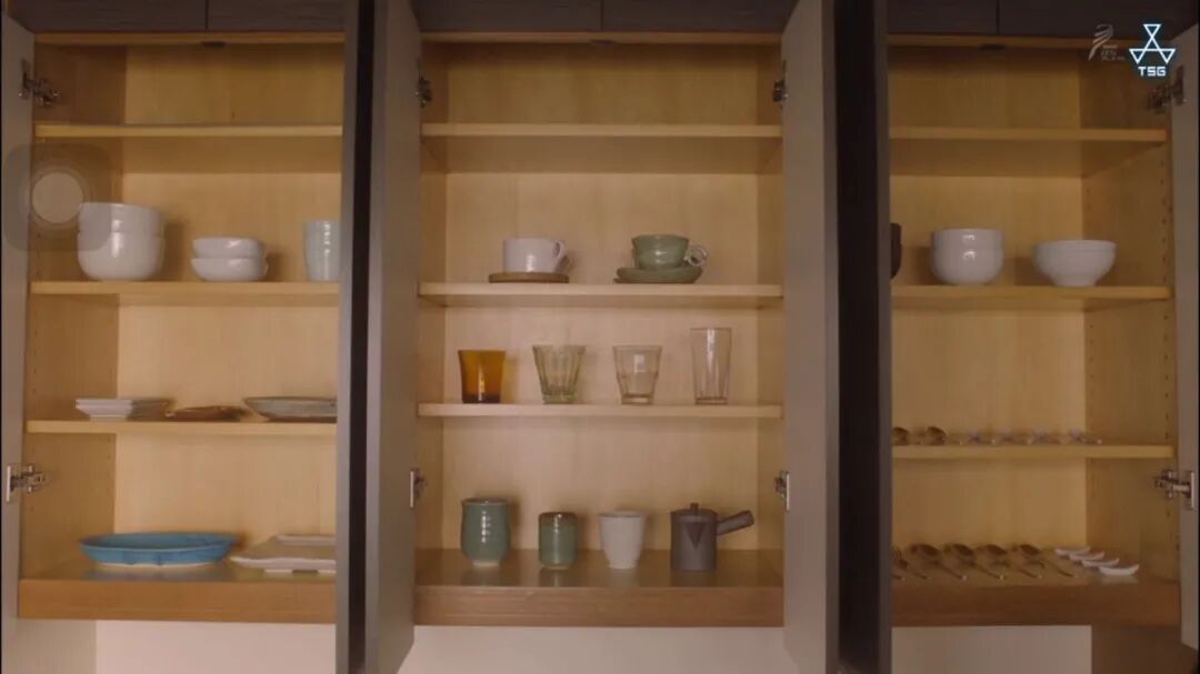 连壁柜中的厨具杯子也都整齐划一地摆放,间距都一样。