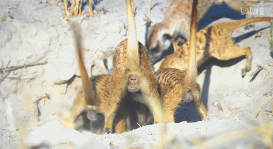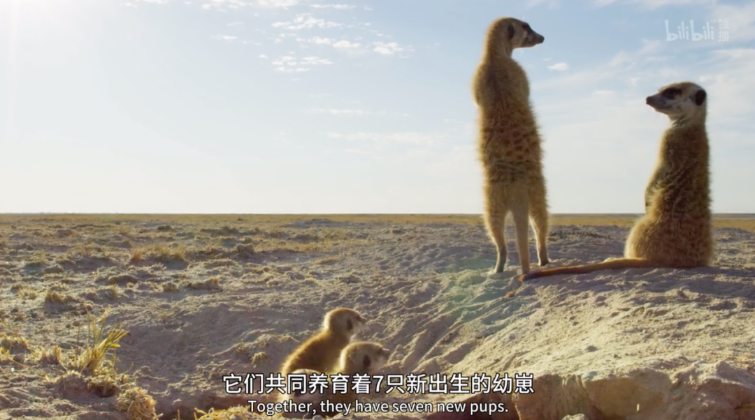 总制片人迈克尔·冈顿,曾执导获得艾美奖的电影《地球生灵》(豆瓣9.3),同样也是《地球脉动 II》(豆瓣9.9)以及《王朝》的总制片人。除此之外,配音也依旧是我们最熟悉的,“世界自然纪录片之父”大卫·爱登堡爵士担任解说。说起狐獴,不免有人会感到疑惑,其实我们所有人都对它很是熟悉:它便是《狮子王》里陪伴着辛巴成长的好朋友,彭彭与丁满中里的丁满本尊。此外,狐獴还曾“参演”过李安导演的《少年派的奇幻漂流》。狐獴大多生活在沙漠上,体型非常小,是社会性极强的动物,通常由2到50只狐獴组成独立的种群。有趣的是,狐獴群体所构建的是一个母系社会,其内部统治者以雌性首领为主。在白茫茫的盐沼小岛上,就有一位新晋的狐獴女王,她叫玛格霍格(片中谐音为“马扣扣”)。两只雌性狐獴是她的姐妹,一位叫小美,另一位叫蜻蜓。另外还有三只雄性,它们共同养育着7只尚未独立的幼崽。气温高达50摄氏度,几个月没下雨的沙漠上,食物匮乏,危险暗生,环境恶劣。马扣扣唯有将家族团结一起,把幼崽养大,它才能建立起真正的王朝。小美是马扣扣的姐姐,负责放哨,确保其他成员安全的觅食。她也是两只幼崽的母亲,马扣扣则是剩下5只幼崽的母亲。有些特殊的是,在狐獴社会里,雌性首领通常不会允许家族的其他雌性繁衍后代。蜻蜓则负责照顾幼崽,是它们的“奶妈”,每天负责穿梭在沙漠里给孩子们找饭吃。然而,在生存环境如此恶劣的情况下,自给自足都困难,更别想照顾到每一只幼崽了。比如孩子们的父亲,雄性首领托哥(托高托纳)就不愿意分享食物,让自己吃饱了再说。唯有家族里最年轻的雄性,博哥(博伊普索)把孩子们的温饱放在了第一位。就在博哥分餐失败,想找小美帮忙的时候,却发现了不幸——作为女王的马扣扣,不得不忍痛抛下小美,带着幼崽们逃离这个危险的地方。但要离开这里,去到前方可以救命的草原上,就必须穿过一片800多米宽的盐沼。实在没办法,马扣扣只好扛下这个责任,跑回小岛上寻找孩子们的身影。马扣扣担当起了筑巢的工作,而爸爸托哥则带着仅剩的独崽去填饱肚子。给崽挖到了新鲜的蝎子饱腹之后,托哥就忙着去找自己的饭了。不管幼崽怎么喊,都找不到自己的爹,迷迷糊糊地走进了另一个狐獴家族之中,跟着陌生人走了。这另一个狐獴家族,是马扣扣家族的敌人,擅自闯入者会被杀死。发现了危险的马扣扣立马发出警报,召集家族商量对策,然而托哥却没有听从女王的指挥,擅自跑到了敌方阵营。如此鲁莽的行为,并没有带来任何实质的帮助,反而让马扣扣一家陷入了更深的危险。对方不仅夺回了自家的幼崽,更头疼的是,马扣扣的孩子还在它们手上。混战之中,马扣扣一家迅速逃进了地堡里,带着幼崽的对家也一路杀了过来。不管在门口吵闹几个回合,对家依然拿马扣扣没辙,也就走了。另一只雄性狐獴拉哥(拉拉乐巴蒂)冲了过去,对托哥是一番拳打脚踢,用嘴撕咬,差点要了它的命。没想到,年纪最小的博哥却挺身而出保护托哥,让它免受一死。托哥也因此被剥夺了雄性首领的名号,马扣扣选择了强壮忠诚、善良勇敢的博哥,成为了新的雄性首领。