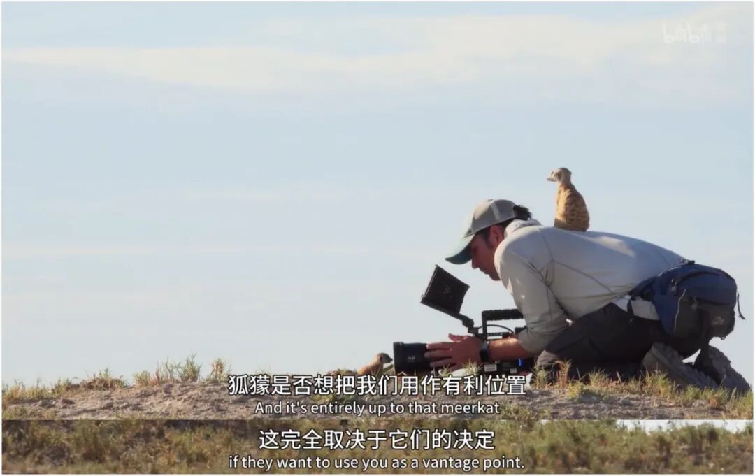 在新一轮降雨到来之前,它们先要扛过狂风刮起的尘暴。幼崽却没能听到女王的警报,最终没能活过这一场沙尘暴。狂风最终带来了久等了两个月的降水,盐沼复活了,草原复苏了,王朝也重生了。春天来了,马扣扣孕育了新的幼崽,但意外又发生了——在狐獴社会里,只有女王拥有生育权,其他的雌性如果怀孕了,则将被驱除出族群。之前由于放任小美诞下幼崽,族群负担过重,七崽尽失的惨案依然历历在目。令人意外的是,过了数月之后,蜻蜓却回来了,没有带着新的幼崽,肚子也变得空瘪。被放逐之后,独自生存的蜻蜓感受到了压力,为了回归家族,它必须做出牺牲。与此同时,马扣扣也诞下了四只幼崽,三个男孩,一个女孩。在此后的迁徙中,马扣扣也吸取了曾经的教训,再也不会丢下幼崽,顾着自己往前冲了。而是将幼崽放在家族的首位,不让它们离开自己的视线范围。它们不再是自私自利的散装个体,而是有着团结意识的家族王朝。动物世界的残酷与真实,仅仅在小小的狐獴社会中,便一览无遗。摄制组花了一年的时间,穿越在草原、盐沼、沙漠之间。当我们正对于片中精巧的拍摄手法感叹之时,背后所汇集的,正是工作人员付出的努力与汗水。要接近只比松鼠大一点点的狐獴,是他们面临的最大的困难。准备好所有需要的精密仪器,随时随地跟着这些小不点奔跑,都是基础。学会怎么和它们相处,追踪它们的生活轨迹,与此同时又不影响它们的日常生活,是一项十分艰巨的任务。随着时间的流逝,这些长枪短炮,也渐渐成为了盐沼地上的一份子。烈日当空,跑到摄影师和摄像机脚底下,这仅有的阴凉处乘凉;放哨时刻,甚至还踩上摄影师的帽子,把他们当成了树,登高望远。“狐獴是否想把我们用作有利位置,这完全取决于它们的决定。”这也是《王朝》的宗旨,绝对不以人类的角度观察动物的世界。即便目睹这小美的离世,眼角抹泪的摄影师们却也只能默默地在摄影机后记录属于动物世界的一切。动物世界里存在的美好与残忍,也都是属于它们的王朝。《王朝》不仅是一出跌宕起伏的《动物世界》,更是残忍的《权力的游戏》,甚至是尔虞我诈的《甄嬛传》。正如迈克尔·冈顿所说,他拍摄《王朝》的初衷,是希望作为人类的我们,能够真正地从动物的角度出发,理解他们的世界:“过往的纪录片中,我们通常以上帝视角观察世界。虽然这些纪录片很受欢迎,但我觉得我们参与度太高。我们从来没有真正花时间与动物相处,真正深入理解过它们的故事。”