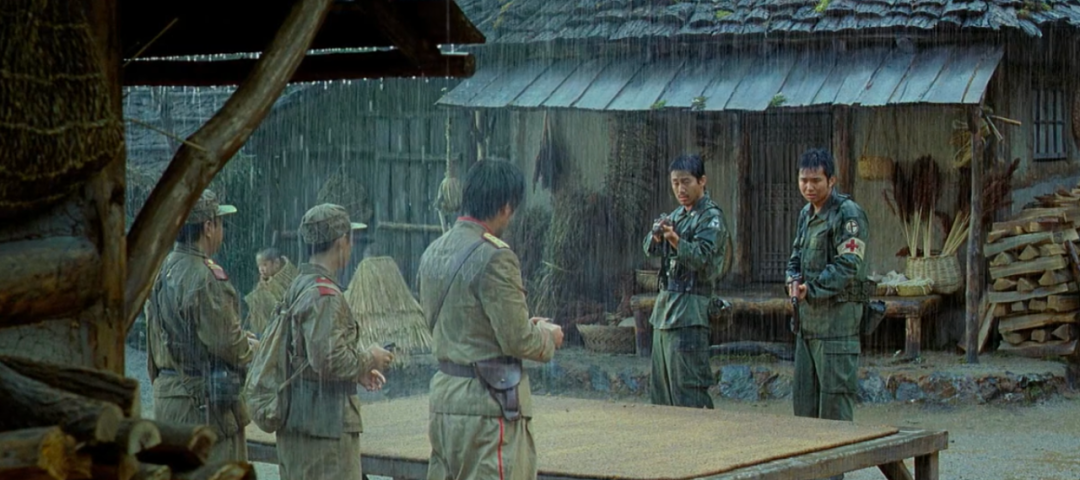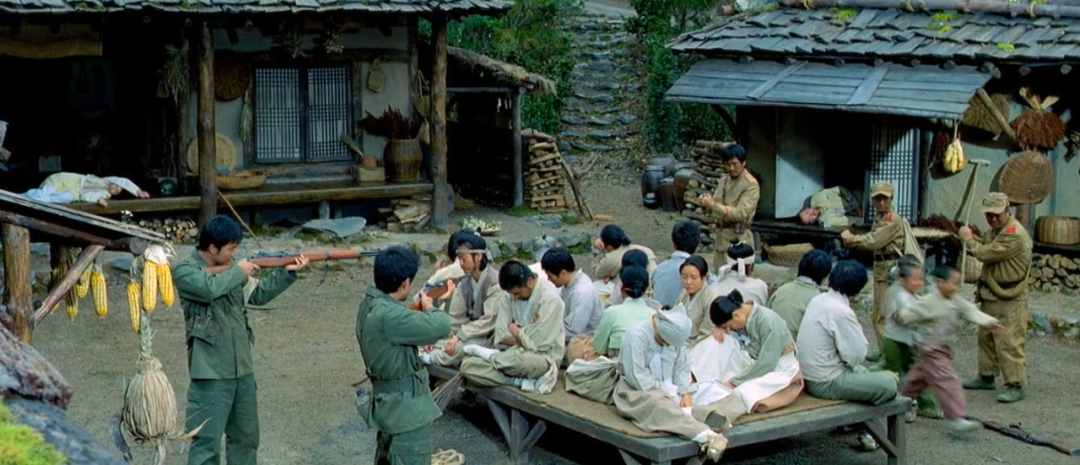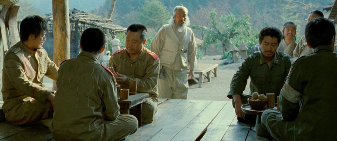 墨山水画般的画面,被评价为“最浪漫的战争片”,很难想象朝鲜南北战争还能拍出浪漫的感觉?几名朝鲜军人、韩国军人以及1名美国空军士兵,阴差阳错流落到一个未受战火波及的世外桃源——东莫村。看完不压抑还能引人深思的战争片,绝对值得五星推荐。故事背景发生在1950年9月,正是朝鲜内战打得如火如荼的时候。而片名中的东莫村却是个世外桃源般的存在,村民们自给自足、与世隔绝。人们穿着韩国传统服装,过着“男耕女织”的田园生活,他们甚至不知道这个国家正在打仗。韩国国军的表铉哲和卫生员文尚相掉队之后干脆当了逃兵,阴差阳错来到了东莫村。与此同时,幸存的朝鲜人民军的李秀华和老兵张荣熙以及少年兵徐泽基,在疯丫头雨怡的带领下也来到了东莫村。而在此之前,美国飞行员史密斯大尉因飞机坠毁,被村民救回。三方人在东莫村不期而遇,立刻拔枪对峙,就要火拼的节奏,夹在中间的东莫村居民却是目瞪口呆莫名其妙。谁都不肯放下枪,这一对峙就对峙了一夜,东莫村的村民也被挟持着在空地上睡了一宿。东莫村的村民没见过枪炮,其实并不害怕,只是出于善良和温和的天性才配合军人。只剩下南北韩的军人还傻傻地在雨中对峙,村民就在旁饶有兴致地围观。戏剧性的一幕发生了:粮仓里的玉米随着一声爆炸变成了漫天的爆米花雨。漫天的爆米花雨像一场天真浪漫的洗礼,让之前精神高度紧张的军人们突然放松了下来,之后在村长的劝和下,南北韩的军人终于放下武器,暂时停战。而之前炸毁的粮仓是东莫村一年的储粮,为了弥补被炸毁的粮食,5名军士被迫留在了东莫村,帮助村民在绿野中收割庄稼。南北韩的军人也逐渐放下各自的立场,在这一片祥和的自然天地下化身普通的农人。此时电影中绿意盎然的自然风景,与影片开头时的战火纷飞形成鲜明对比。放下武器的人南北韩军人开启了互相吐槽模式,南韩军人觉得是北韩军人在侵略南方。而北韩军人认为是南韩把美国人领进国门侵略他们,他气愤地向北韩军官抱怨对方污蔑。而人民军的军官李少华却打断了士兵们的争论,意味深长地说:的确是我们侵略了南方。很快这略尴尬的气氛就被一只突然出现的野猪打破,全片最搞笑的一幕也发生了。接下来是一连串戏剧性的慢镜头,朝鲜人,韩国人,美国人,东莫村村民,男人,女人,小孩……果然在吃货眼里没有比吃更重要的事,再深的矛盾也抵不过饥饿。三方人很快有说有笑地吃起烤猪肉,势不两立的矛盾如此简单地被一只烤猪化解了。而军人们也换上了村民的衣服,逐渐融入了东莫村平静快乐的生活。随着相处的日子一天天增加,这三方人之间产生了微妙的感情。他们既不能完全忘记自己的立场,但又无法不惺惺相惜。渐渐地,他们有了对话,有了交流,有了超越战争的友情。