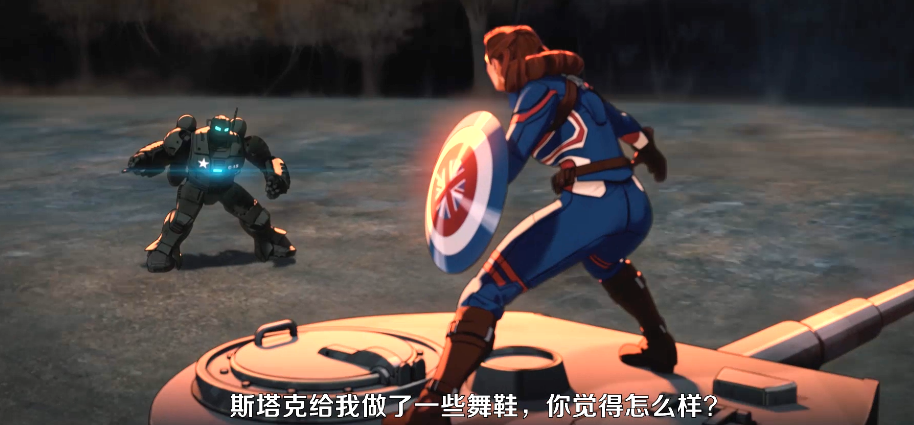 史蒂夫也没有闲着,他驾驶着斯塔克给他的钢铁机甲,和卡特并肩作战。