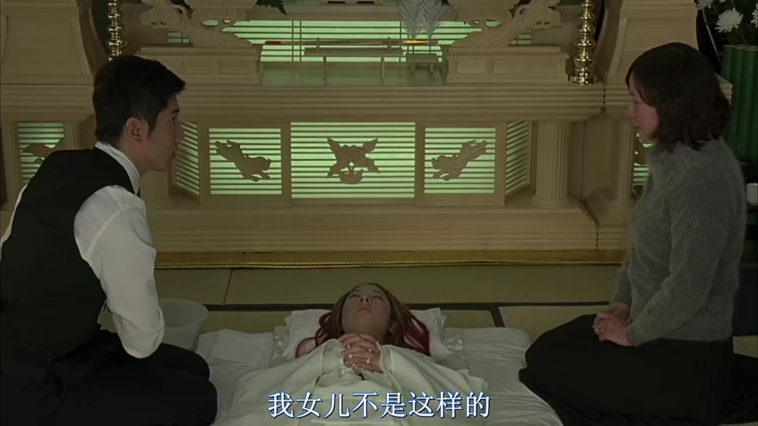 社长开始细致地为女人清理更衣,入殓时的每一个步骤、每一个动作都仿佛凝固在流动的空间里。