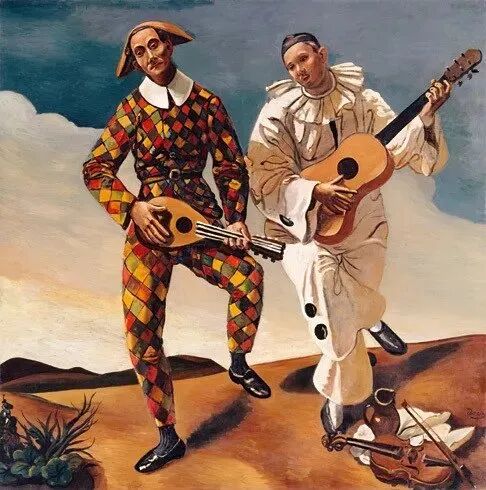 左边穿花格的哈勒昆负责搞笑滑稽,右边穿白色长袍的皮埃罗是远离他人的孤独丑角 。