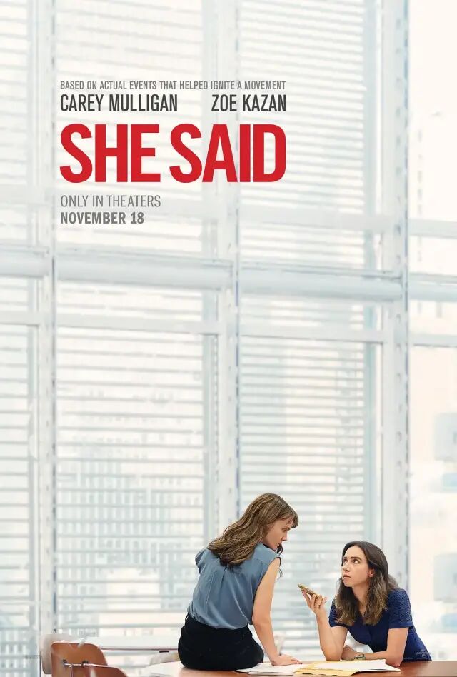 影片《她说》根据畅销书《她说:打破性骚扰的故事,帮助点燃了一场运动》。讲述了这位“好莱坞上帝”是如何在女性团结的力量下,得到应有的惩罚。《纽约时报》女记者乔迪·坎托尔与梅根·吐赫二人在报社主编的带领下,一直致力于揭露美国,无论是政坛还是职场上的霸凌与骚扰。收到装有排泄物的恐吓信、做完产检后接到扬言要将她“先奸后杀”的恐吓电话、穷追不舍闹到电视新闻的抹黑......而这一次她们将矛头对准了强大、已经约定俗成多年的好莱坞“规则”和“体系”。揭露的对象,便是在好莱坞可以通过其高超的公关技术,在奥斯卡等多项美国电影大奖评选中呼风唤雨的哈维·韦恩斯坦。