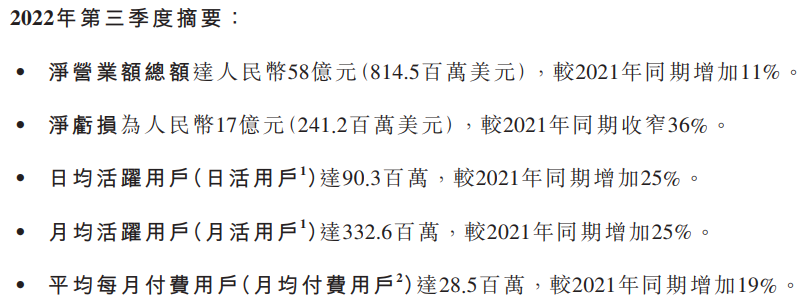 三季度,增值服务营收为22亿元,较去年同期增长16%,主要由于公司加强了商业化能力建设,且增至服务包括大会员、直播服务及其他增值服务的付费用户数量均有增加所致。
